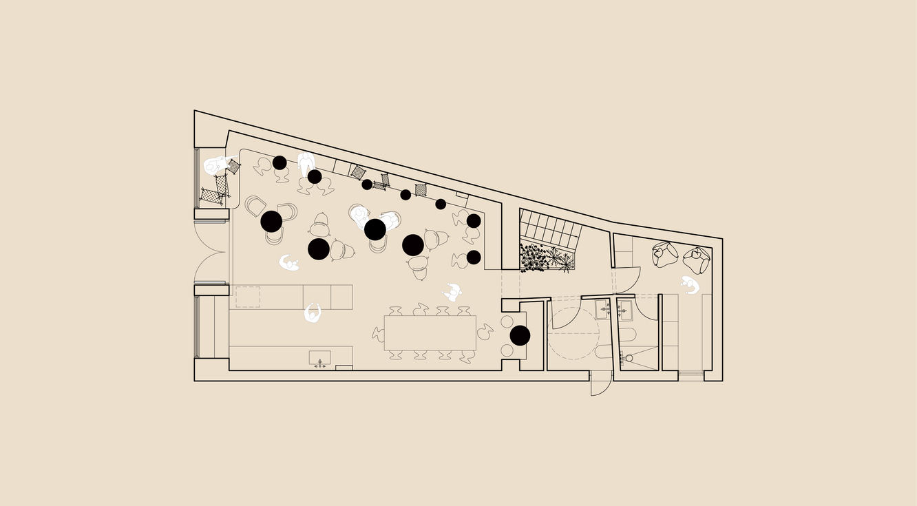 The interior of the cafe is divided into three parts and is suitable for different types of social gatherings. At the entry of the cafe, on both big windows, there are high wooden surfaces incorporated, used either as a table or a bench. The latter continues by the wall all around the cafe, making it a perfect spot for little groups or individuals. At the central part of the space, guests can sit on bigger lounge chairs and enjoy some traditional Indian food to accompany the tea. This part of the space is also suitable for larger groups of people, as the positioning of chairs and tables is extremely flexible. In the back of the cafe, there is a big, common-use table, where people can come with their laptops to work.
